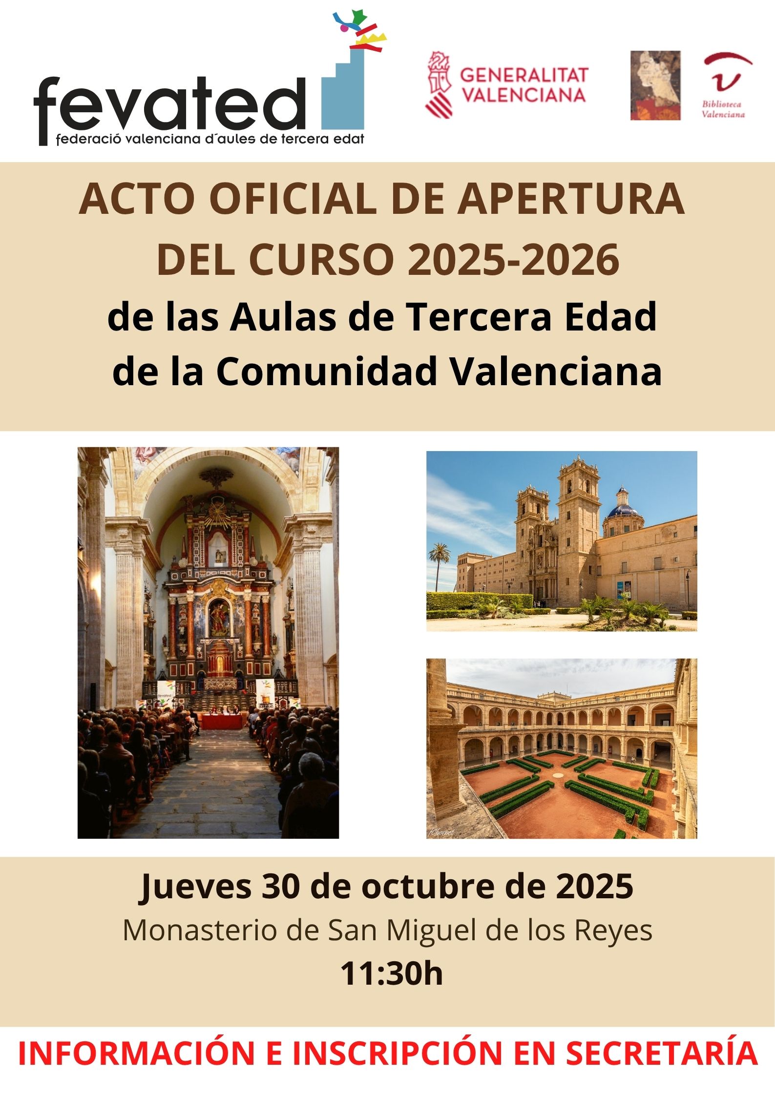 El próximo jueves 30 de octubre a las 11:30h la Federación Valenciana de Aulas de Tercera Edad, celebra el Acto Oficial de Apertura del Curso 2025-2026.