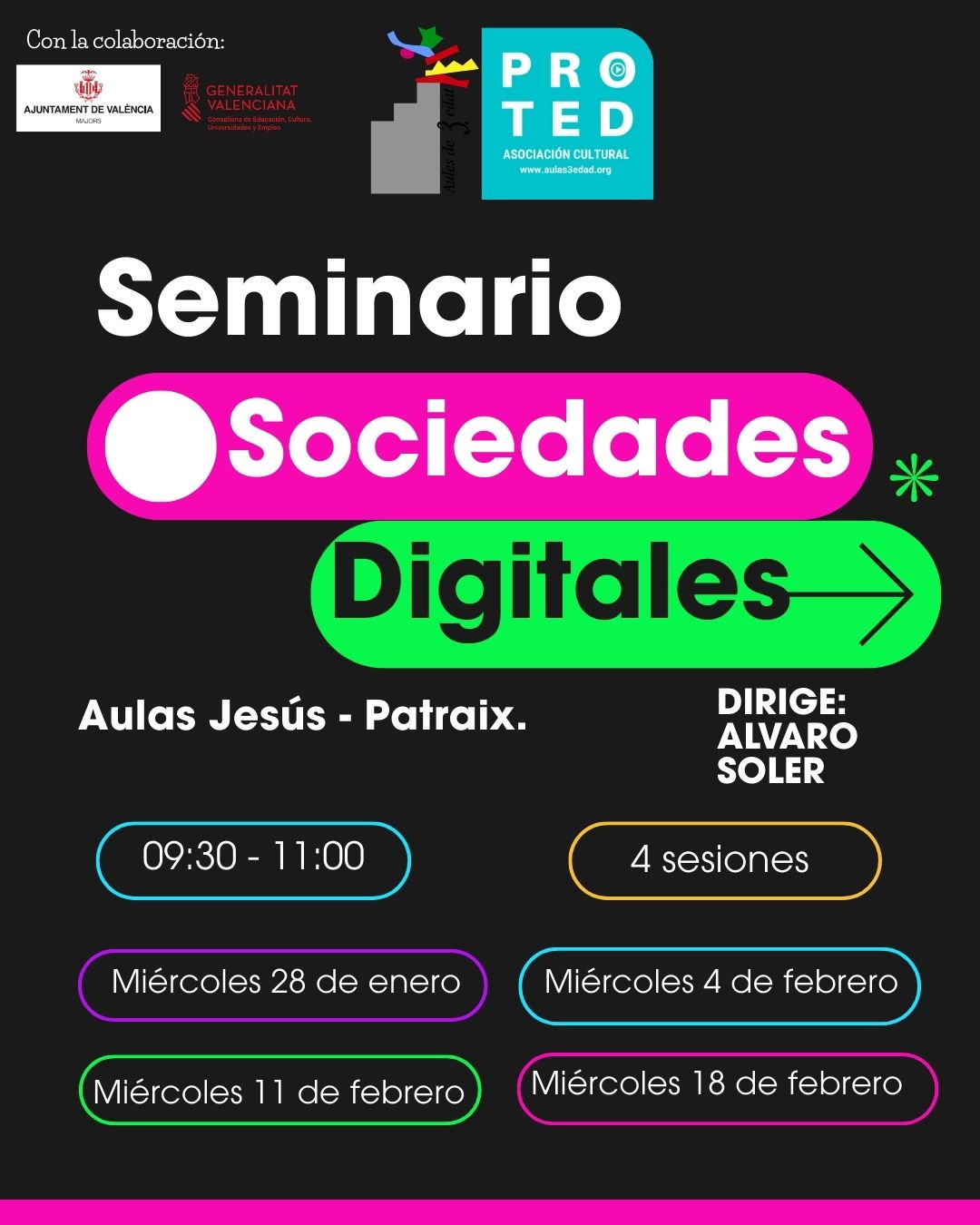 Data i horari: 4 sessions. Els dimarts 27 de gener i 3, 10 i 17 de febrer de 09.40 a 11:00h en Aules El Grau i els dimecres 28 de gener i 4, 11 i 18 de febrer de 09.30 a 11.00 h en Centre Social Senabre, Carrer Llanera de Ranes, 30 sota
